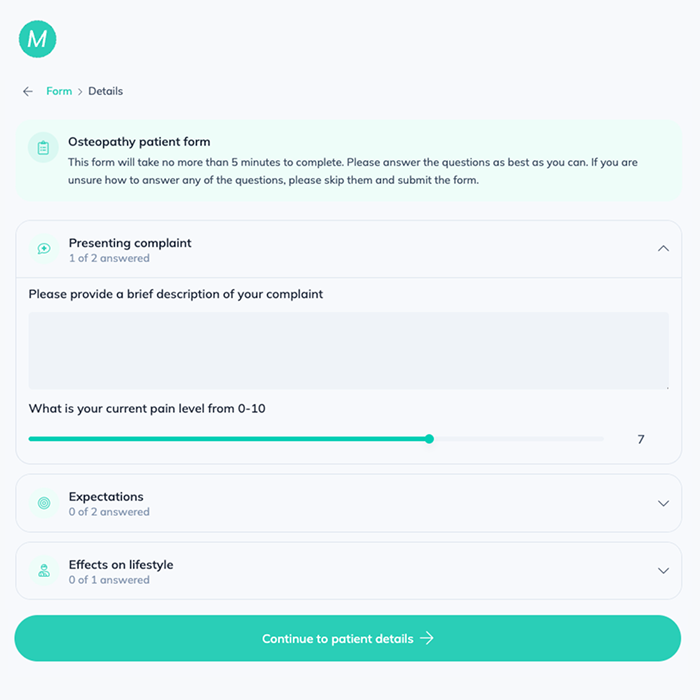 Forms enable patients to complete information about themselves and their complaint before attending an appointment.